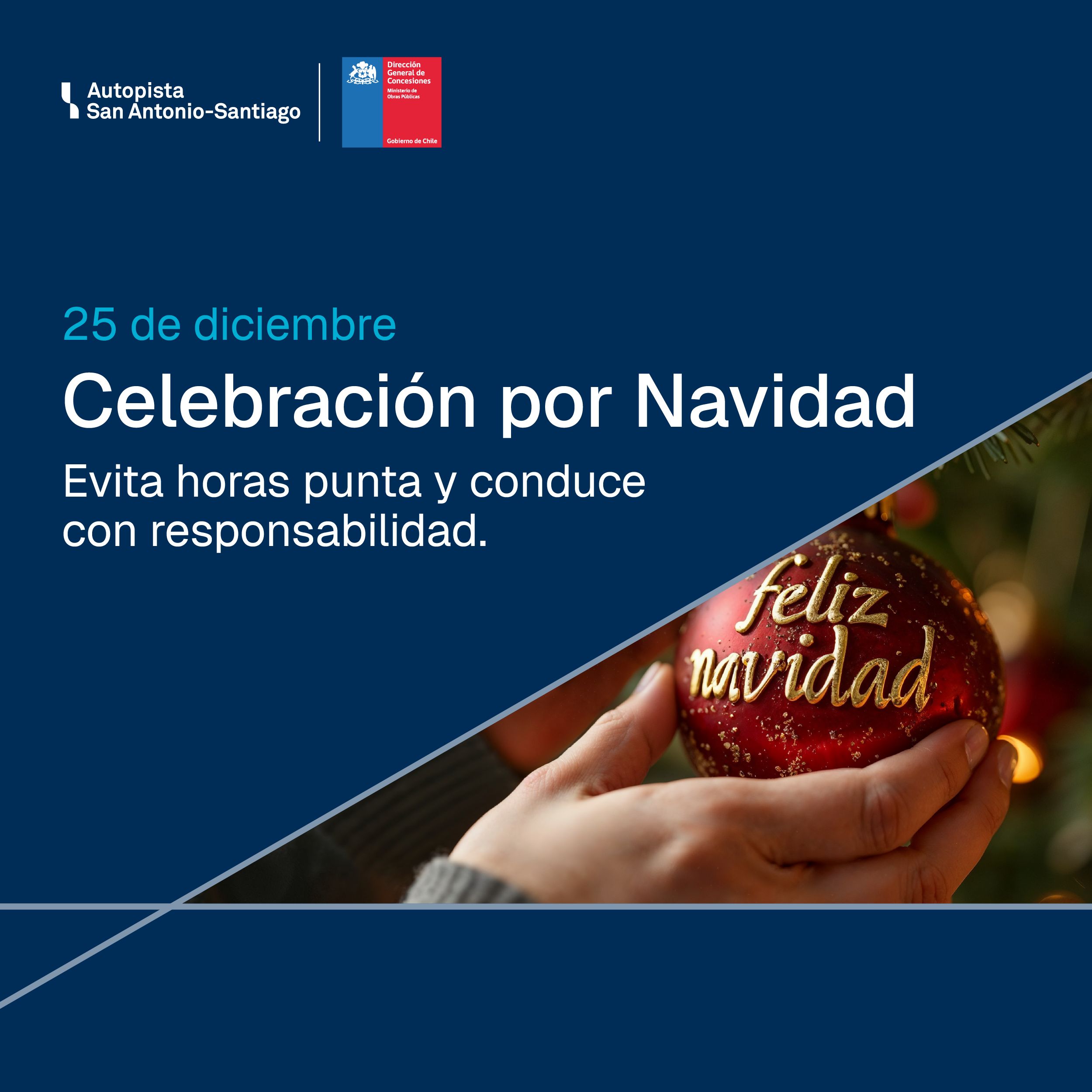 Con motivo de la celebración de la Natividad del Señor, queremos acompañarte para que disfrutes de un viaje seguro, cómodo y sin contratiempos. Durante estas fechas, Autopista San Antonio – Santiago (Ruta 78) reforzará sus equipos de asistencia en ruta y te invita a seguir estas recomendaciones para un desplazamiento más eficiente: Planifica tu viaje con anticipación, antes de salir, revisa el estado del tránsito y programa tu trayecto considerando los horarios de menor flujo vehicular.