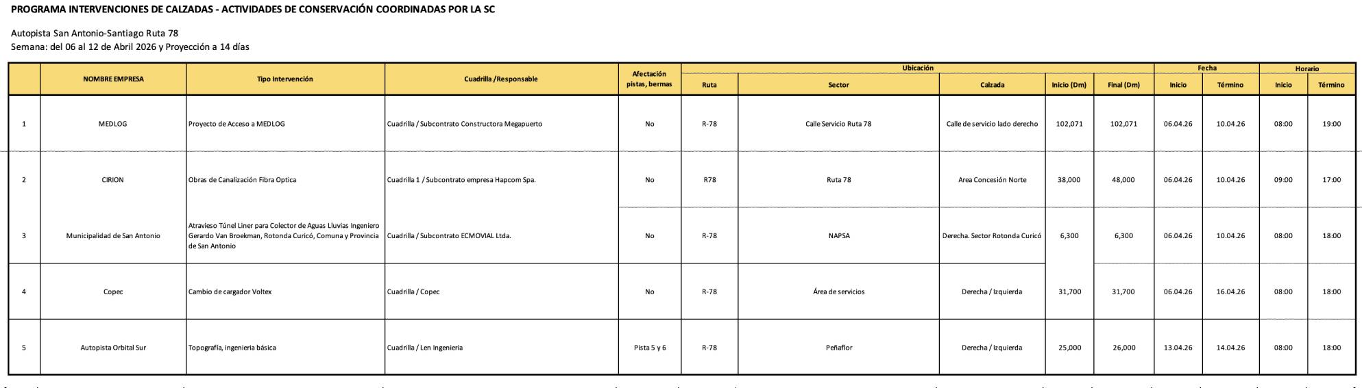 Trabajos en Ruta, semana del 6 de Abril 2026.