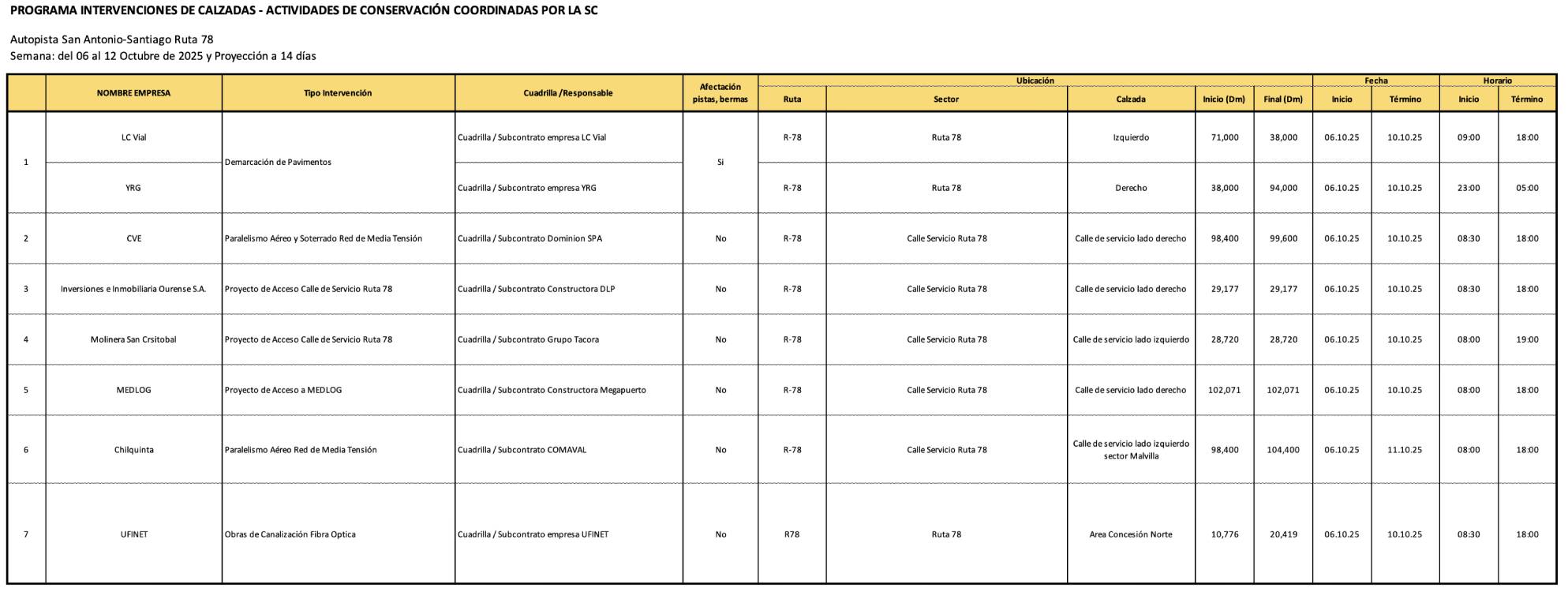 Calendario de trabajos en Autopista San Antonio-Santiago, Ruta 78.