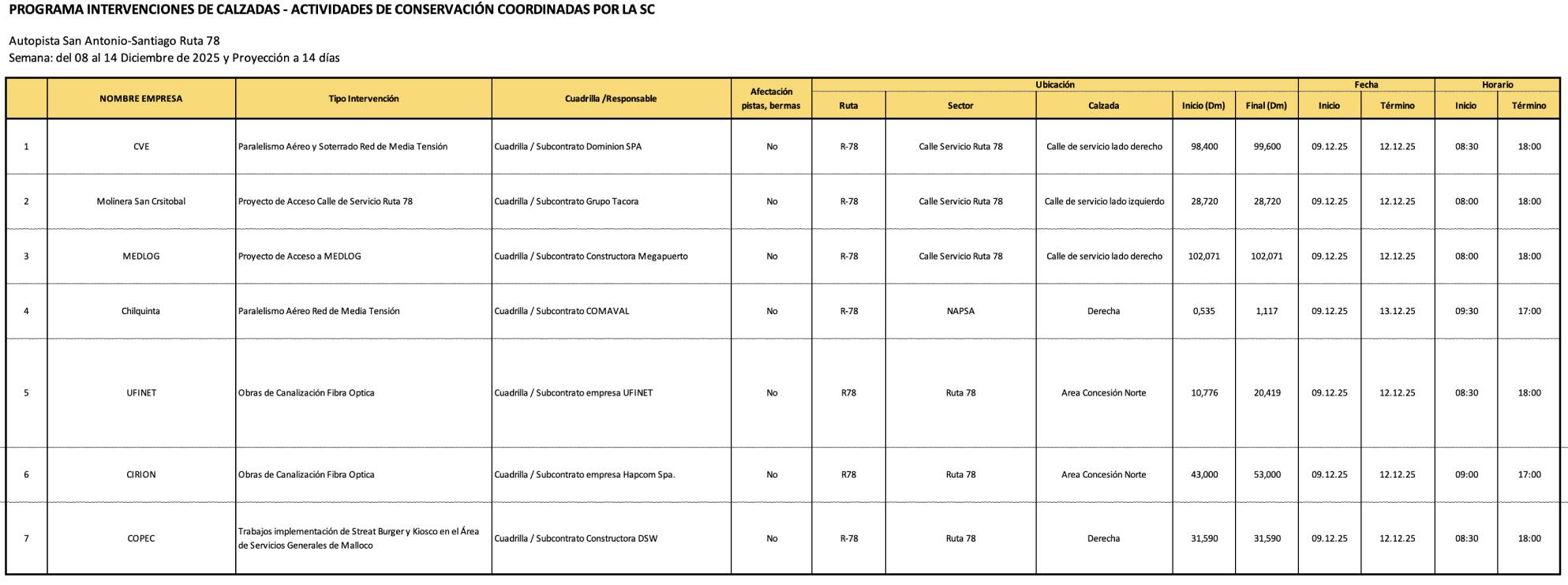 Trabajos en Ruta, semana del 8 de diciembre 2025.