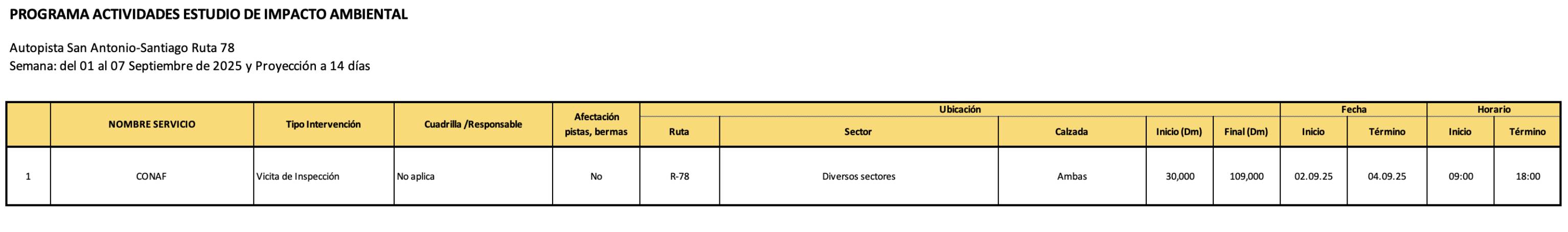 Programa actividades estudio de impacto ambiental, semana del 1 de Septiembre 2025.