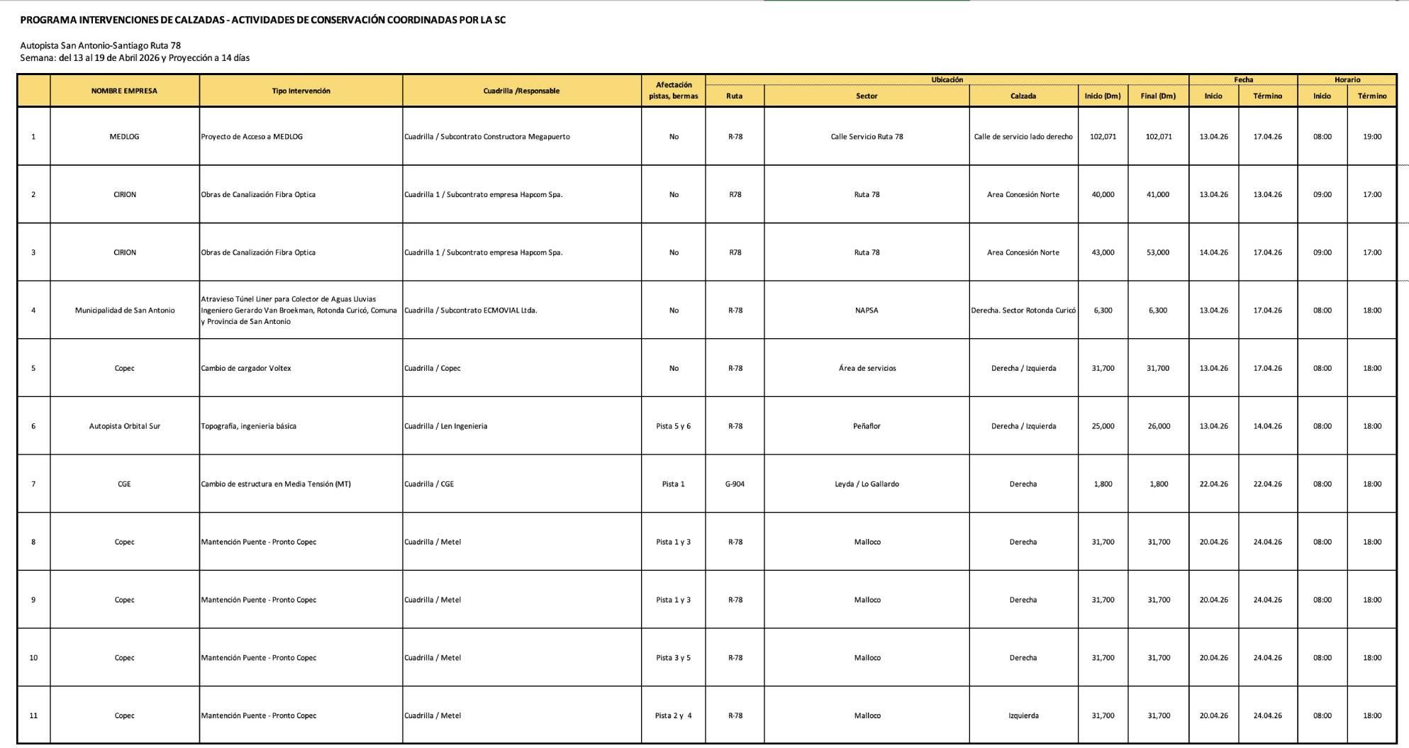 Calendario de trabajos en Autopista San Antonio-Santiago, Ruta 78.
