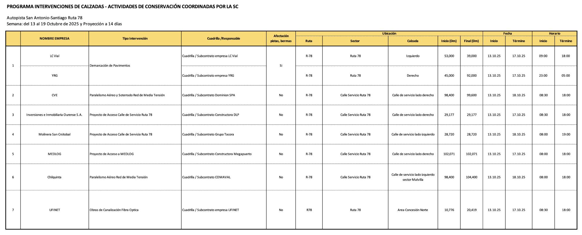 Trabajos en Ruta, semana del 13 de Octubre 2025.