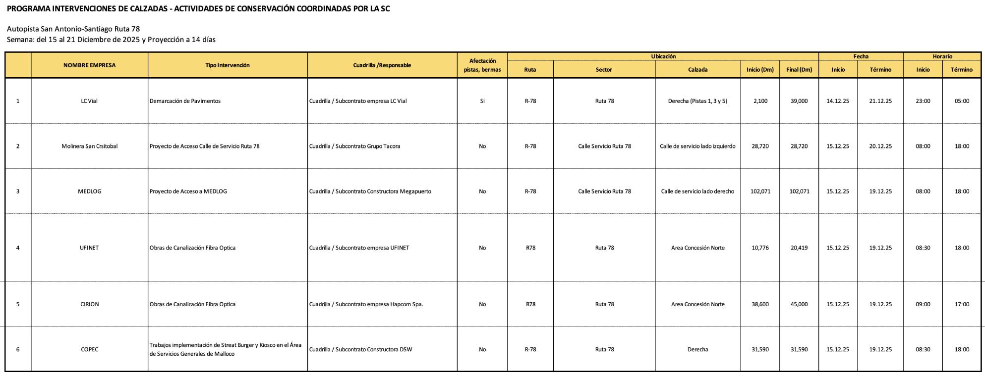 Trabajos en Ruta, semana del 15 de Diciembre 2025.