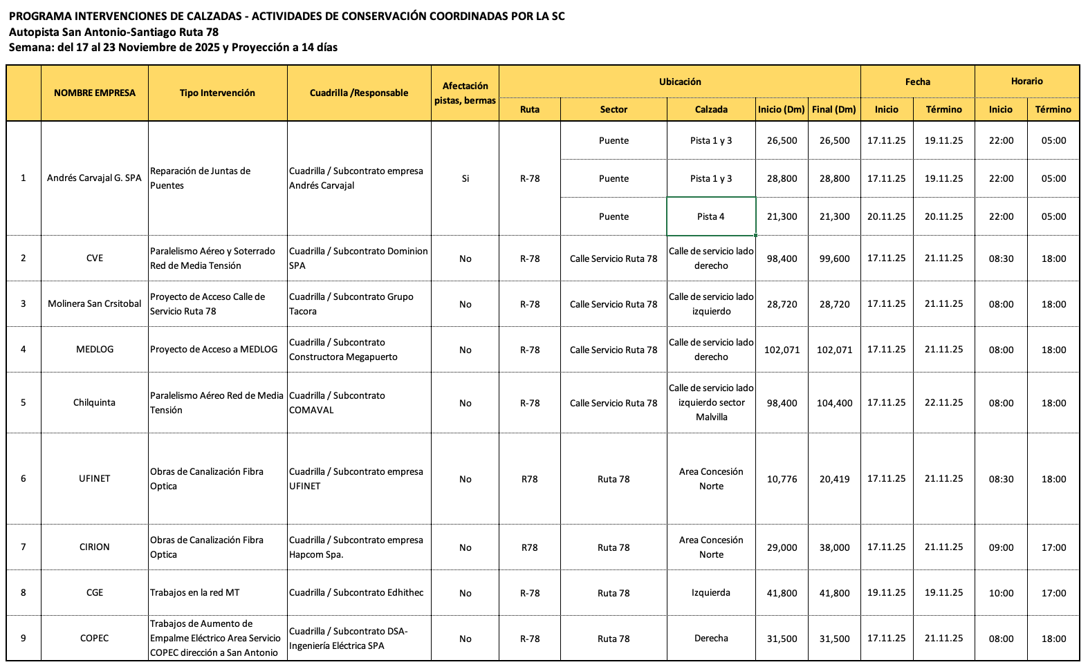 Calendario de trabajos en Autopista San Antonio-Santiago, Ruta 78.