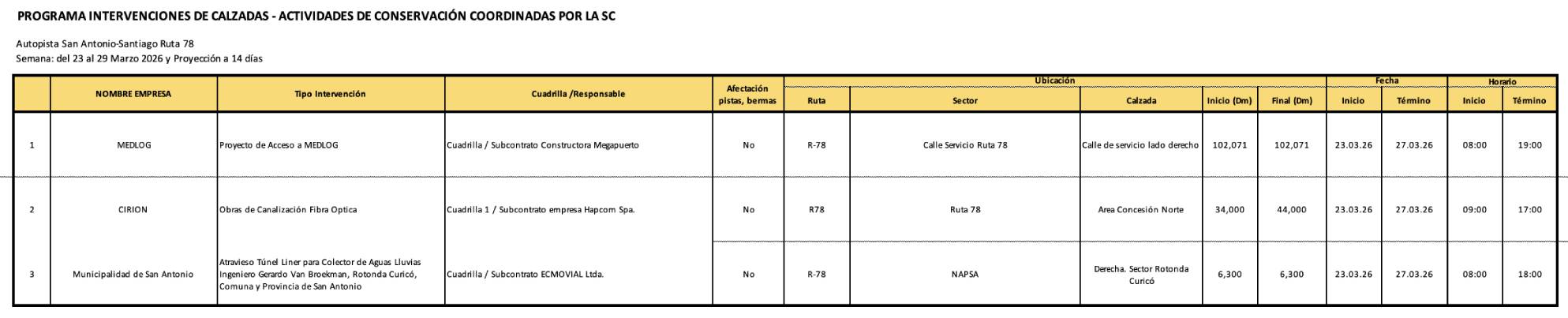 Calendario de trabajos en Autopista San Antonio-Santiago, Ruta 78.