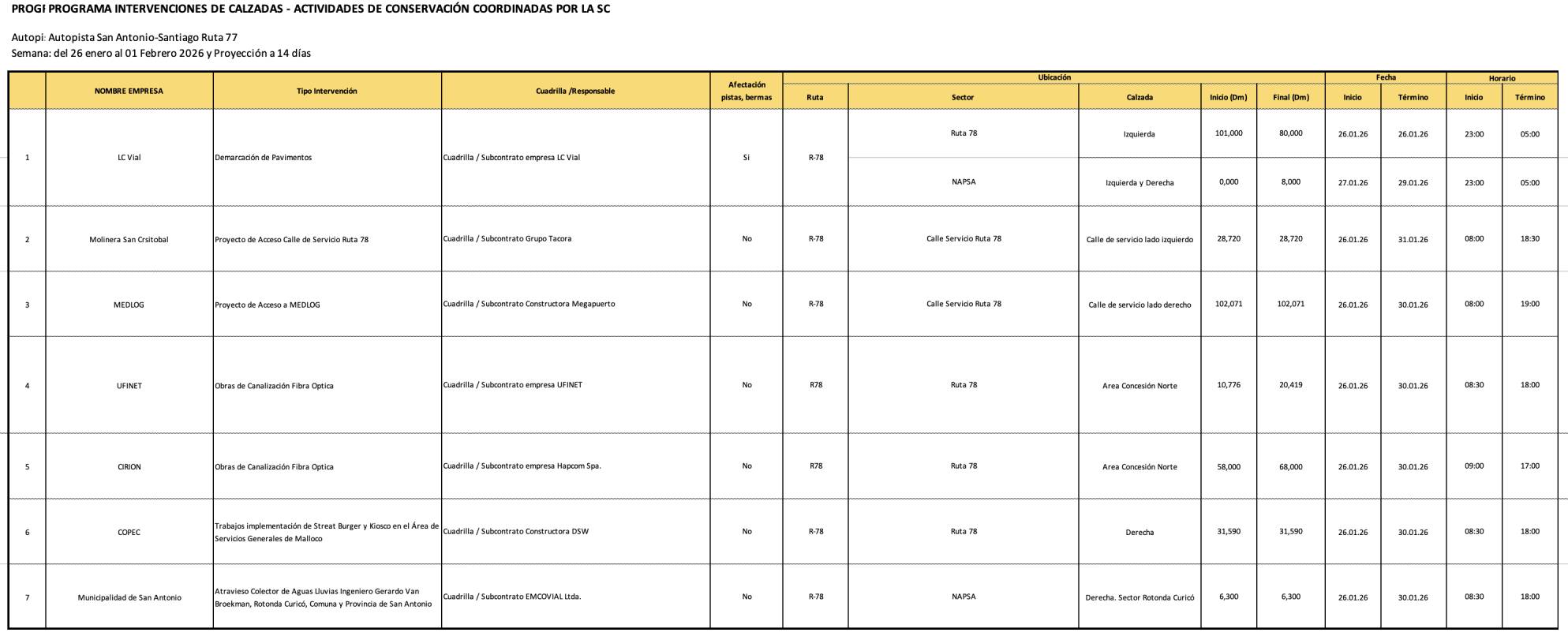 Calendario de trabajos en Autopista San Antonio-Santiago, Ruta 78.