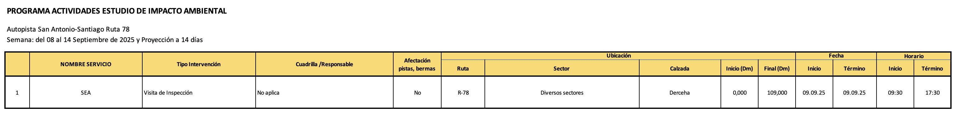 Programa actividades estudio de impacto ambiental, semana del 8 de Septiembre 2025.