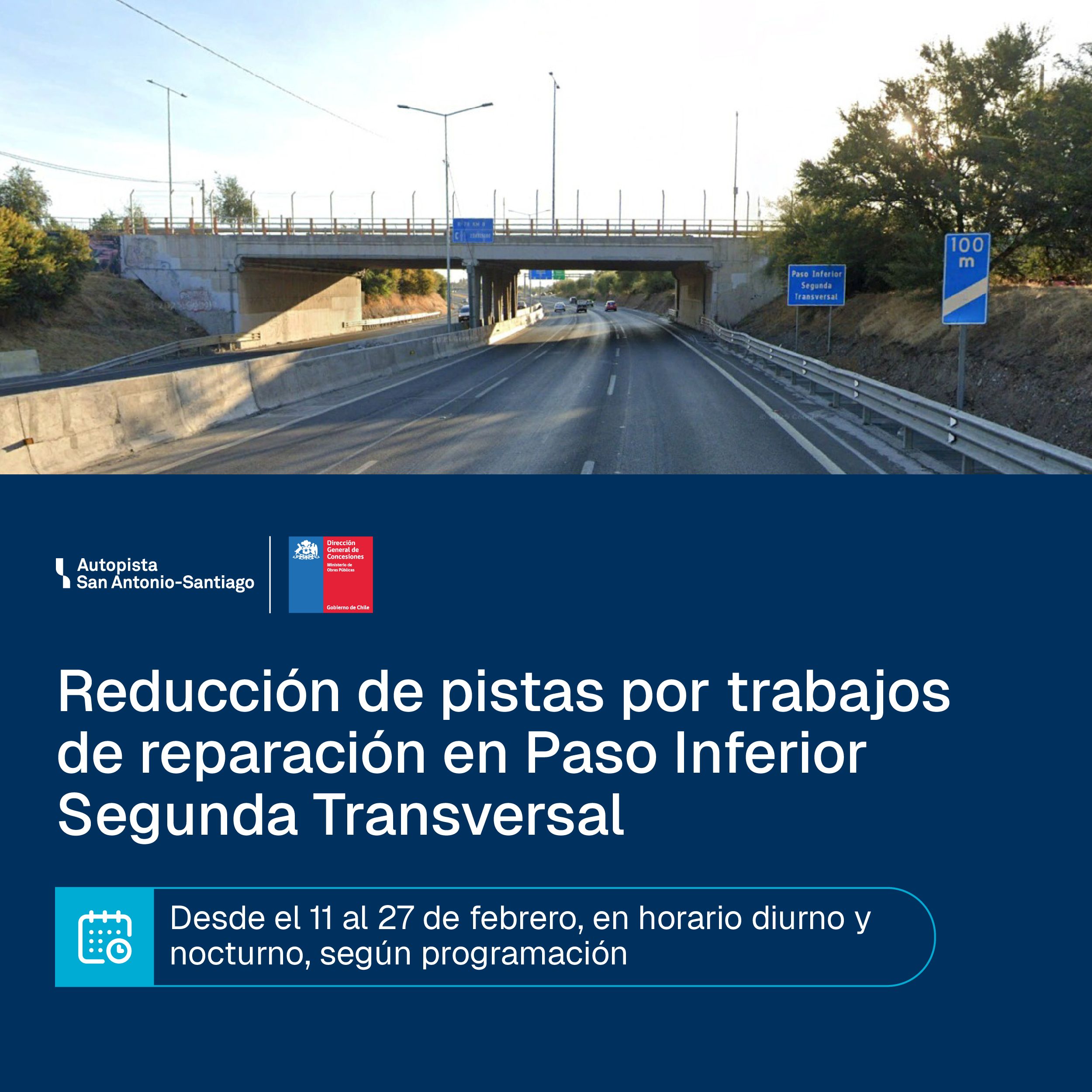 Con el objetivo de ejecutar trabajos de reparación en una viga estructural del Paso Inferior Segunda Transversal, se implementarán restricciones de tránsito en la Ruta 78, en dirección a San Antonio, a la altura de la comuna de Maipú. Las obras se desarrollarán entre el 11 y el 27 de febrero de 2026 , en el tramo comprendido entre los kilómetros 6,9 y 8,4, e incluirán intervenciones tanto en horario diurno como nocturno, de lunes a viernes, de acuerdo con la programación establecida.