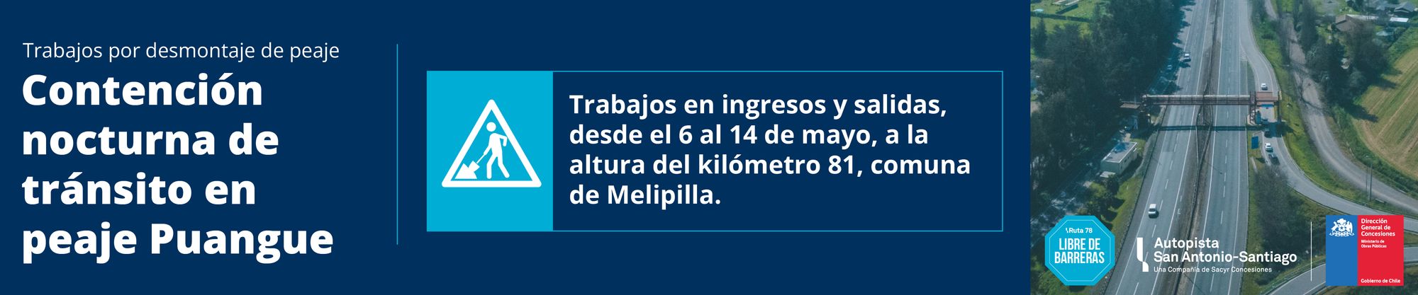 Entre el 6 y el 14 de mayo se realizarán trabajos de desmontaje de peajes en el ingreso y salida a la localidad de Puangue, a la altura del kilómetro 81, comuna de Melipilla. Las intervenciones contemplan contenciones de tránsito en horario nocturno para generar el menor impacto posible en los usuarios utilizando un rango horario de baja afluencia vehicular.