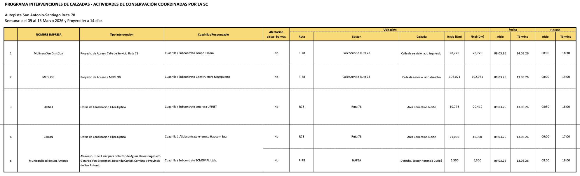 Calendario de trabajos en Autopista San Antonio-Santiago, Ruta 78.