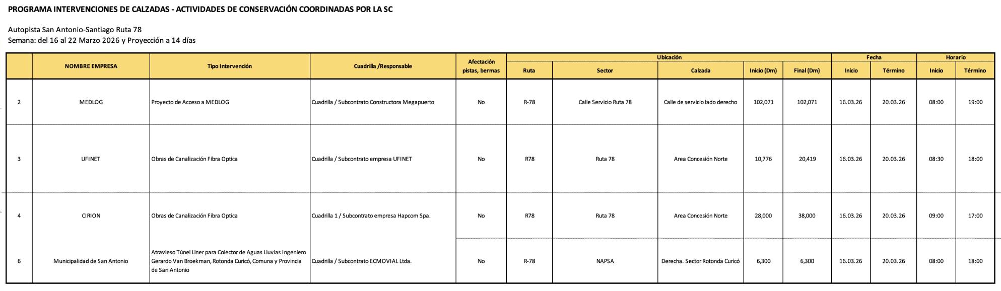 Calendario de trabajos en Autopista San Antonio-Santiago, Ruta 78.