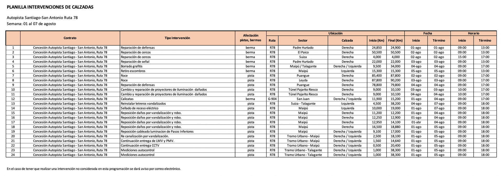Calendario de trabajos en Autopista San Antonio-Santiago, Ruta 78.